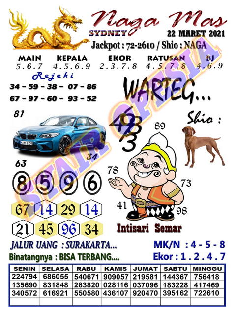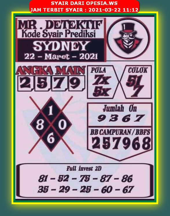 Syair SYDNEY Hari Ini Ramalan SDY Terlengkap. Kami akan membagikan dan secara menambahkan syair-syair sdy atau syair sidney terbaru dan terjitu setiap harinya. Jika syair sudah beredar maka akan otomatis akan ditambahkan pada web sbobet syair. Syair Sydney 22 maret 2021Forum syair sydney senin Bersama dengan web himpunan syair toto hari ini. Pencari angka jitu Ramalan Si Mbah Lontong tiap hari kami ingatkan bahwa kode Bergambar dibawah ini berlaku untuk 3 pasaran sekaligus Pasaran Singapore pools sgp Hongkong pools Hk Sydney pools Sdy. Prediksi SDY Syair Sydney senin 22 maret 2021 Angka jitu sydney atau lebih dikenal dengan sebutan prediksi sdy adalah sebuah penafsiran angka yang akan keluar di saat pengumuman keluaran togel sydney.