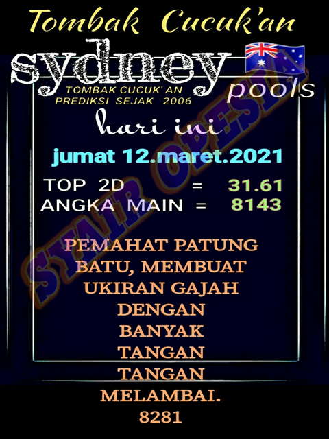 Prediksi Sydney Jumat 12 Maret 2021. Angka Main 2 9 0 3 Shio Tikus Ular Macau 04 31 Colok Bebas 3 0 Kepala Ekor 6 7 1 2 4 8 2D PATEN BB 12 14 18 27 41 62 64 68 72 74 78 86 ANGKA PATEN 86 27. Prediksi sdy 9 juli 2021 kami akan membagikan dan secara menambahkan syair-syair sdy atau syair sidney terbaru dan terjitu setiap harinyasyair togel sydney. JON4D Syair Togel Sydney 12 Maret 2021 Prediksi Syair Sydney 12 Maret 2021 Kode Syair Sydney Prediksi Syair Sdy Hari ini Prediksi Syair Sdy Jitu Keluaran Togel Sydney Hari ini Syair Sydney. Shio juga masuk ke dalam perhitungan. Prediksi yang kami berikan hari ini pastinya sudah dihitung dengan sangat tepat.