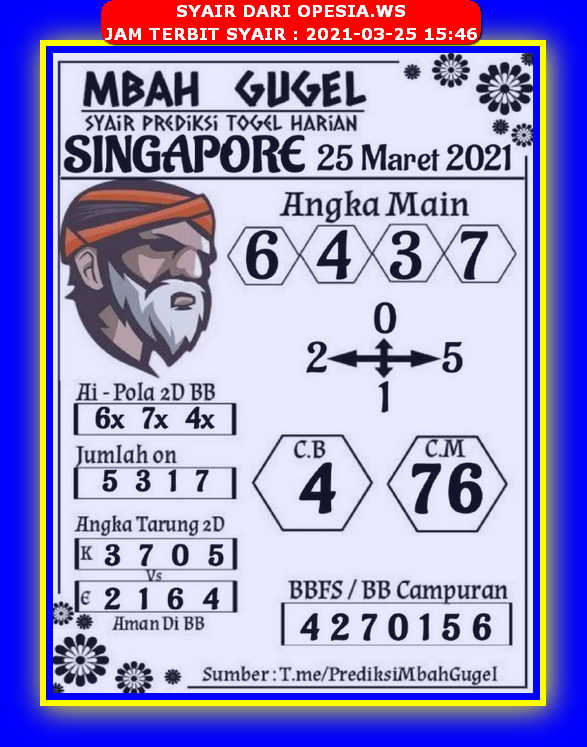 Bocoran togel sgp 25 maret 2021. Bocoran togel sgp 25 maret 2021. SINGAPORE KAMIS 25 MARET 2021 SYAIR TOGEL Yang dimana di dalam website syair ini akan membahas kode-kode didalam pemasangan angka togel. Pencari angka jitu Ramalan Si Mbah Lontong tiap hari kami ingatkan bahwa kode Bergambar dibawah ini berlaku untuk 3 pasaran sekaligus Pasaran Singapore pools sgp Hongkong pools Hk Sydney pools Sdy. Dalam Hal Permainan Togel. 3 7 minutes read.