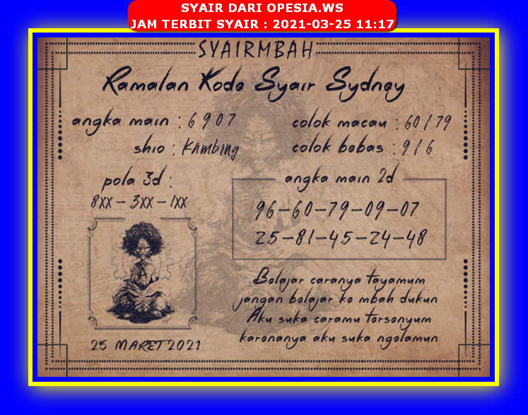 Kami merangkum semua syair yang beredar di masyarakat untuk memudahkan para member kami untuk memasang angka di pasaran togel sydney. Syair SYDNEY Hari Ini merupakan sebuah gambaran dari sekumpulan ramalan ramalan hongkong yang tersebar di dunia maya saat ini apabila anda merupakan pamain togel lama maka pastinya sudah tidak asing lagi dengan hal hal ini dan tidak bisa di pungkiri bahwa syair togel ini banyak menjadi acuan. Syair sydney opesia 4-6-2021. Semoga SYAIR TOGEL SYDNEY 25 MARET 2021 bisa membantu para pemain togel untuk menemukan gambaran angka jitu yang ada di syair tersebut dan bisa merasakan Jackpot di dalam bermain angka togel..